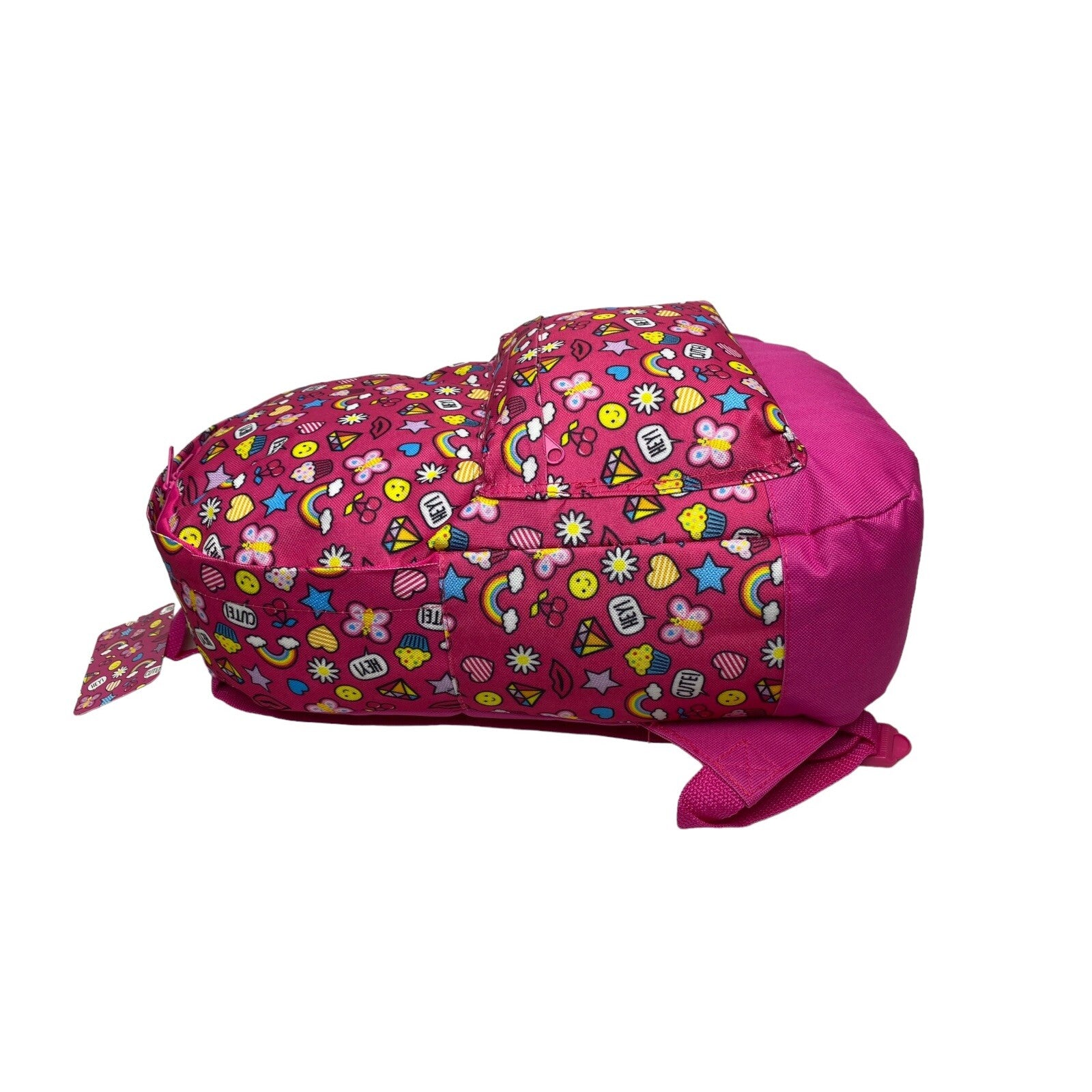 This adorable pink backpack is perfect for your little girl! Featuring a fun and playful design of hearts and rainbow, it's a great choice for school or everyday use. The backpack is made from durable polyester material and has a spacious interior to store all her essentials.